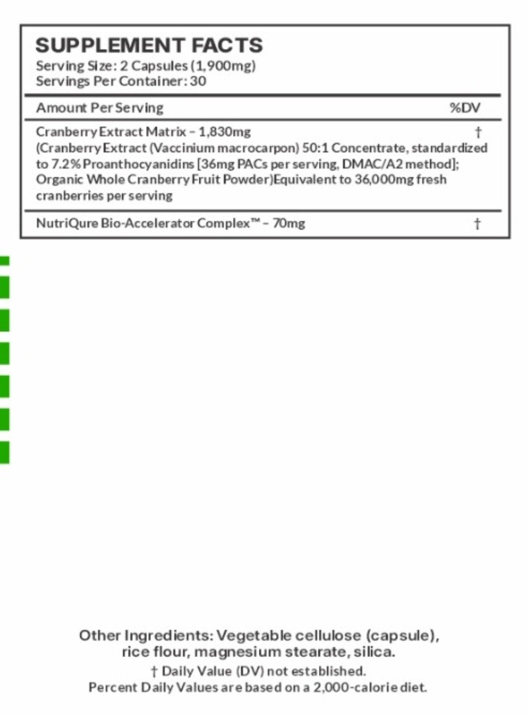 Each serving delivers a clinically validated cranberry extract standardized using the DMAC/A2 PAC method, guaranteeing 36mg PACs per serving—the gold standard for microbial anti-adhesion activity.