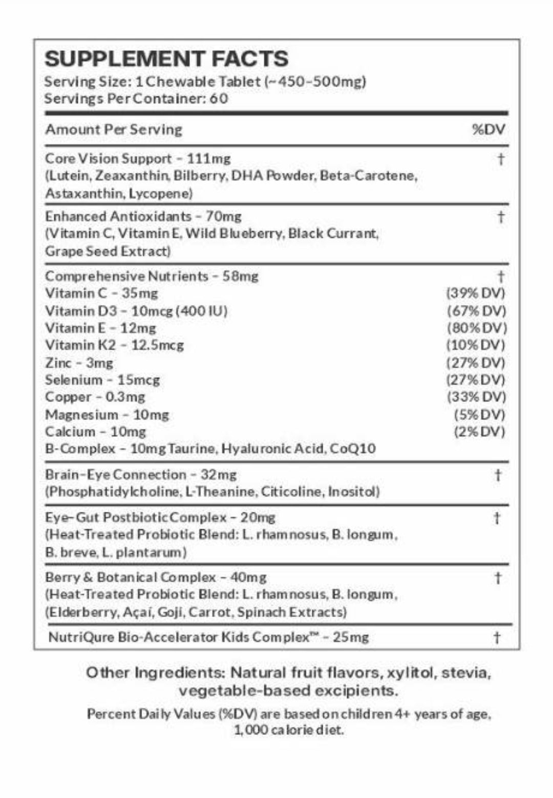 Your child’s screen time, nutrient gaps, and modern diet can put a strain on healthy eye development and brain performance. That’s why we created HerbaVision™ Kids—a delicious, pharmacist-formulated, chewable supplement designed to protect growing eyes, support brain–eye coordination, and defend against oxidative stress. Each yummy tablet is packed with eye-nurturing carotenoids, plant-based antioxidants, essential vitamins and minerals, plus our kid-friendly postbiotic blend to support the eye–gut connection.