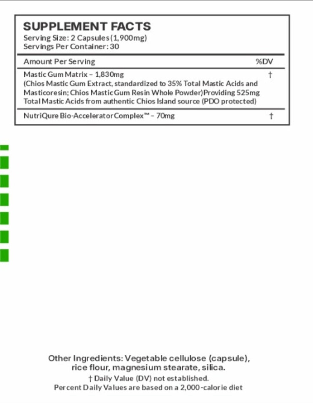 This ultra-pure, dual-form matrix (standardized extract + whole resin powder) delivers 35% total mastic acids, providing industry-leading potency synergized by the NutriQure Bio-Accelerator Complex™ for enhanced absorption and rapid onset.