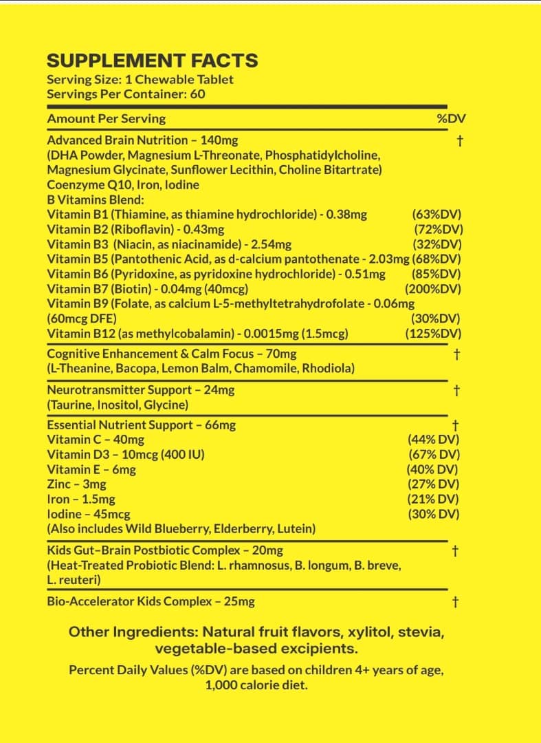 Mega Mind Kids is a pharmacist-formulated neuro-nutritional chewable developed to help children aged 4+ unlock better focus, calm energy, and optimal brain development. Whether it’s staying on task at school or winding down at bedtime, Mega Mind Kids nourishes growing brains with bioavailable nutrients, gentle adaptogens, and gut–brain balancing postbiotics—all in a single tasty tablet.