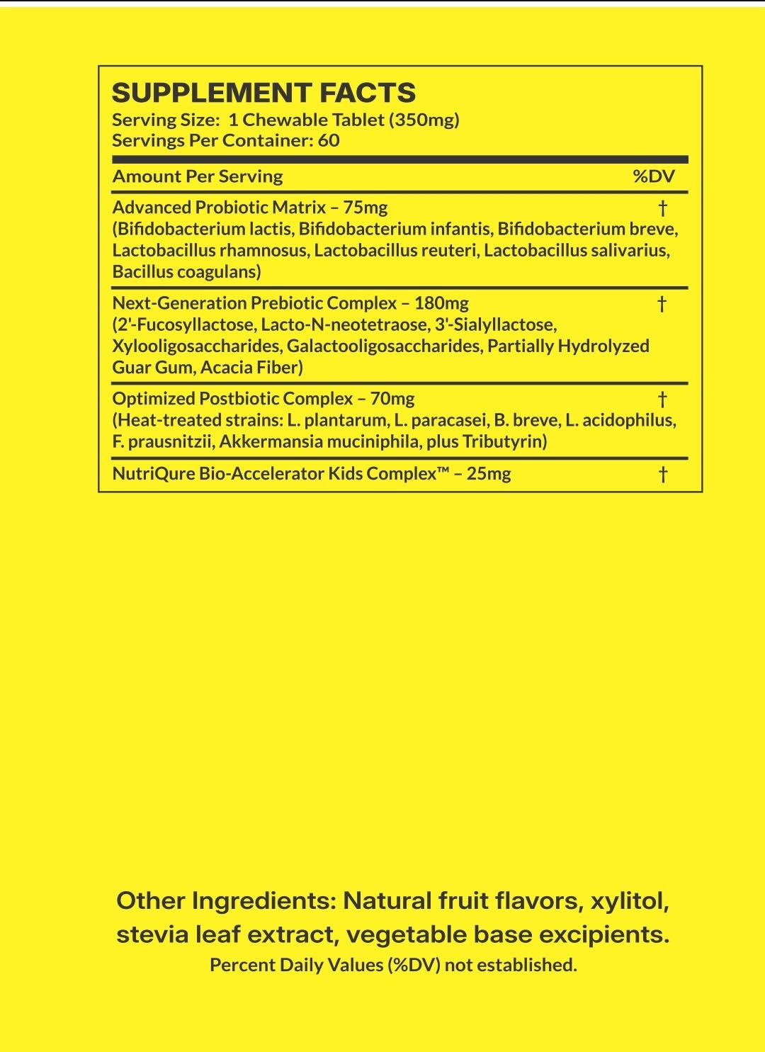 Each delicious chewable contains clinically researched strains plus the NutriQure Bio-Accelerator Kids Complex™ to ensure gentle absorption and better microbiome resilience.