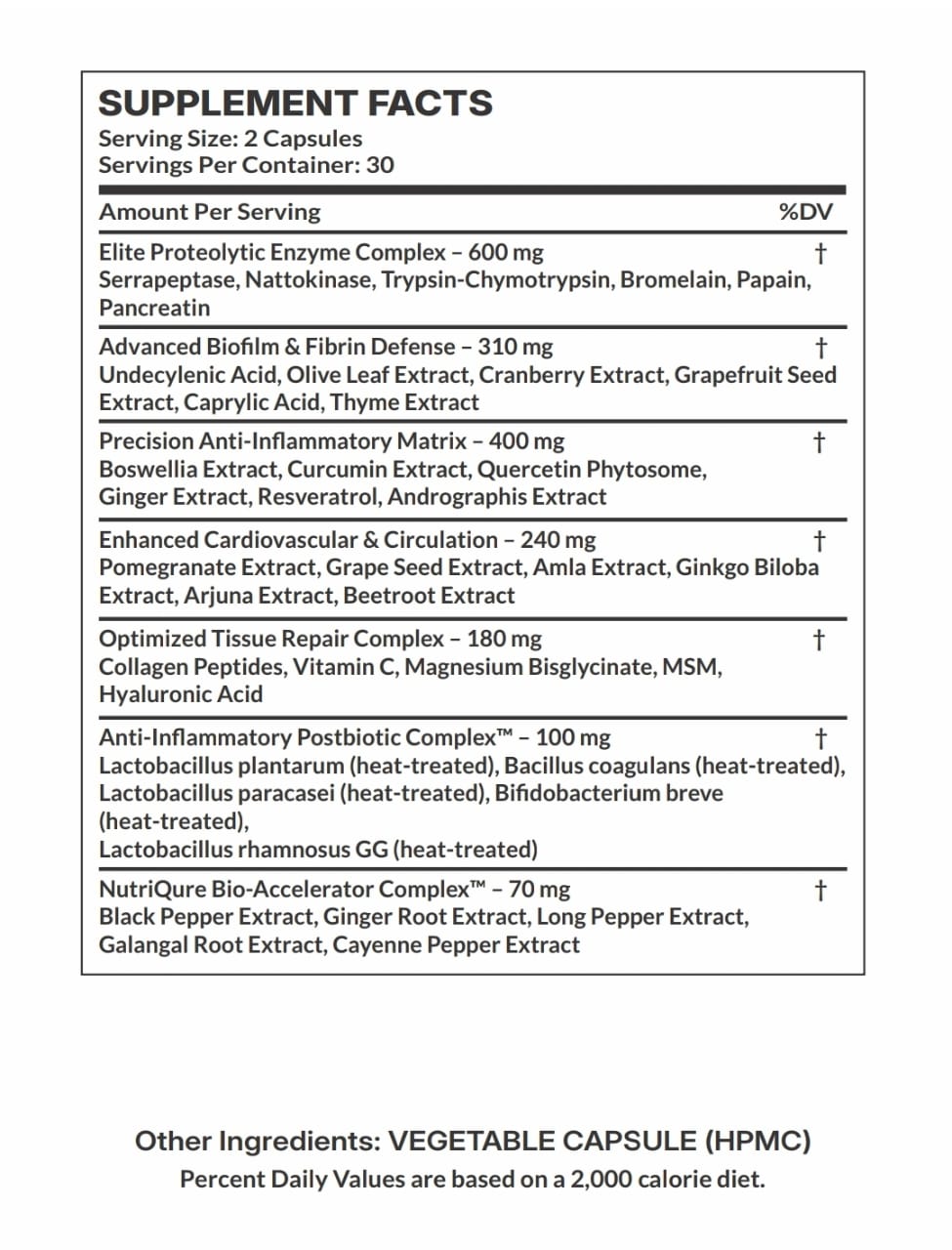 At its core is the Elite Proteolytic Enzyme Complex (600mg) featuring Serrapeptase, Nattokinase, Trypsin-Chymotrypsin, Bromelain, Papain, and Pancreatin — a powerful matrix designed to break down fibrin, scar tissue, and inflammatory proteins systemically.